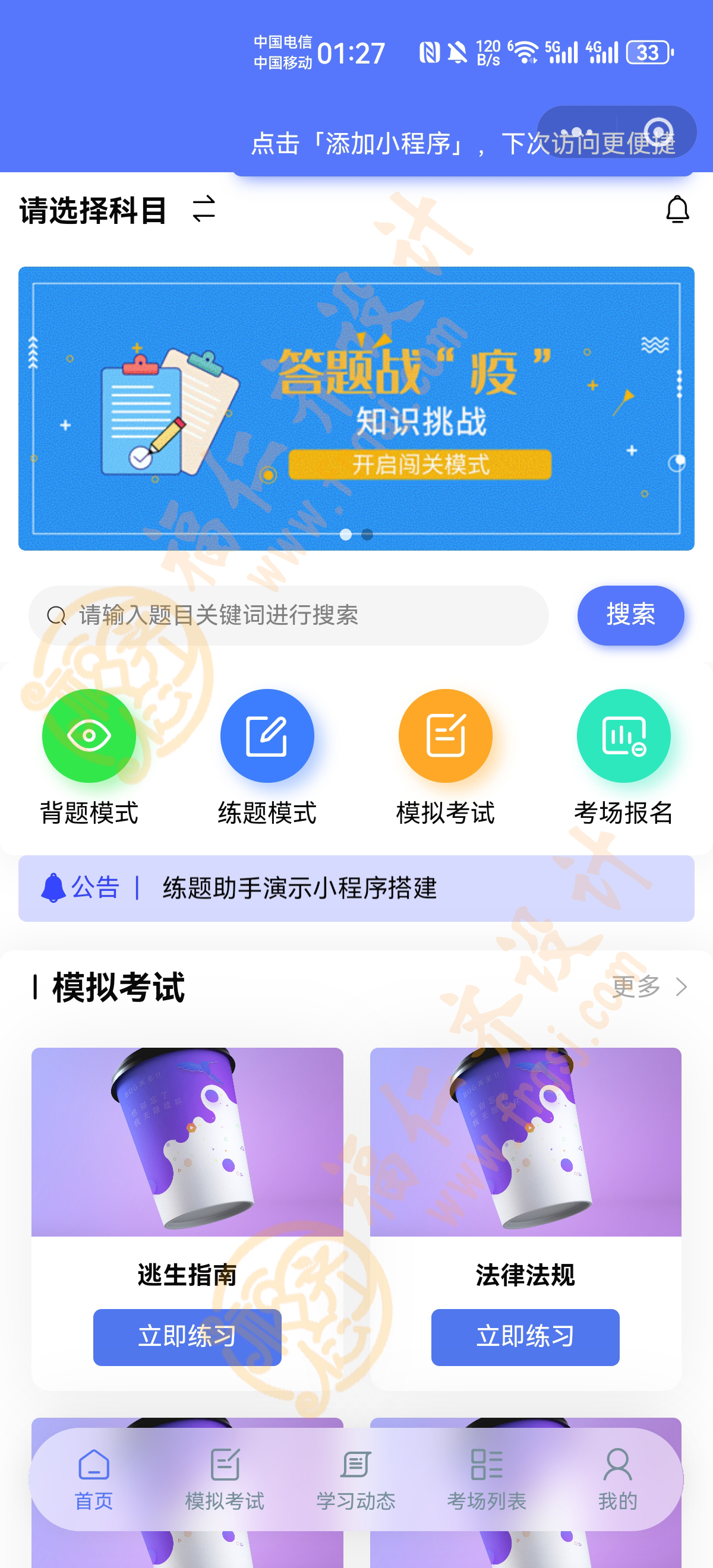 这一款基于福仁齐设计开发的小程序答题考试系统,支持多种试题类型、多种试题难度、练题、考试、补考模式,提供全部前端+后台源代码基础框架,同时支持源码二开定制、专业协作或全程代办小程序备案申请服务。