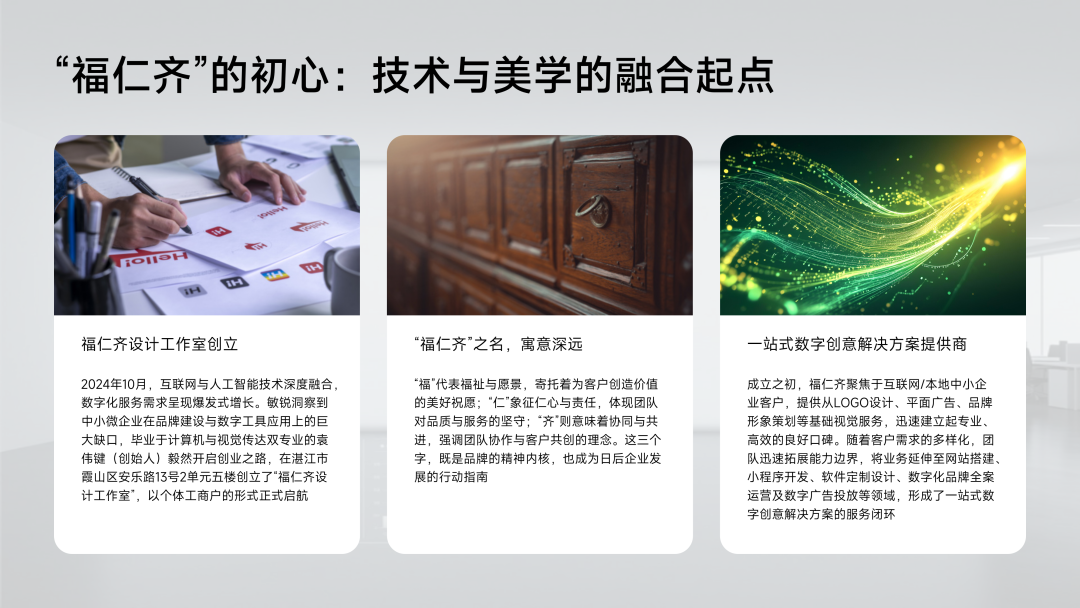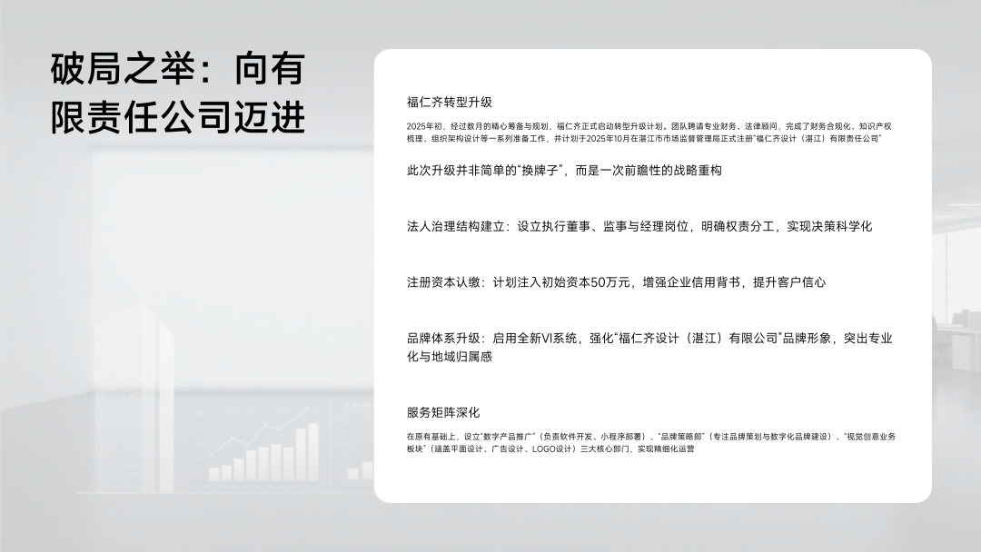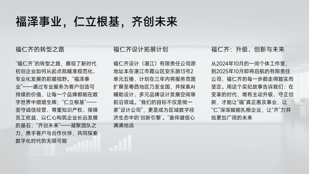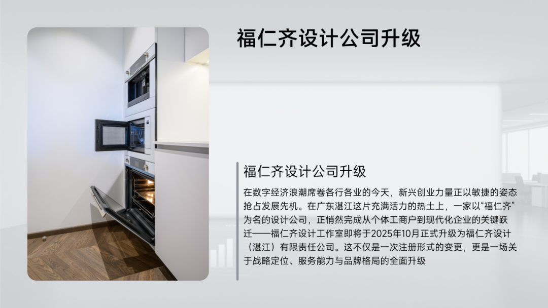 品牌体系升级:启用全新VI系统,强化“福仁齐设计(湛江)有限公司”品牌形象,突出专业化与地域归属感。