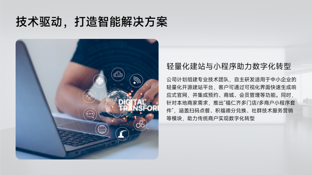 公司计划组建专业技术团队,自主研发适用于中小企业的轻量化开源建站平台,客户可通过可视化界面快速生成响应式官网,并集成预约、商城、会员管理等功能。同时,针对本地商家需求,推出“福仁齐多门店/多商户小程序套件”,涵盖扫码点餐、积福德分兑换、社群技术服务营销等模块,助力传统商户实现数字化转型。