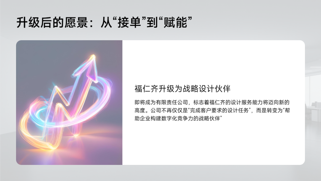 公司积极探索“设计+科技+营销”的融合模式。未来计划为本地企业提供定制化管理软件开发服务,集成数据采集、生产调度与客户关系管理功能,提升运营效率。这种“软硬结合、内外兼修”的服务模式,将成为福仁齐的核心竞争力。