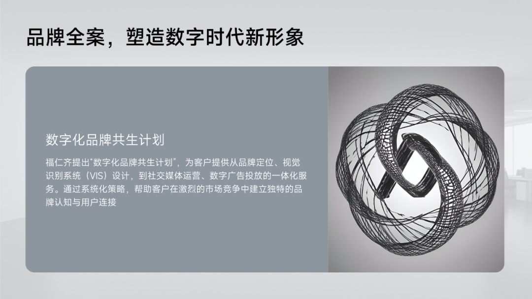 福仁齐提出“数字化品牌共生计划”,为客户提供从品牌定位、视觉识别系统(VIS)设计,到社交媒体运营、数字广告投放的一体化服务。通过系统化策略,帮助客户在激烈的市场竞争中建立独特的品牌认知与用户连接。